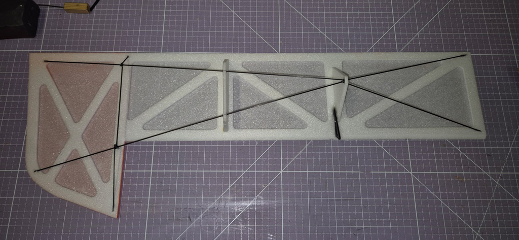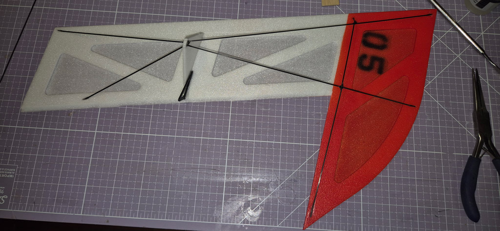 Flugfertig wiegt er jetzt 195g mit einem 2S 800mAh Akku von Hacker. Ein kleinerer Akku würde zwar noch ein paar Gramm sparen, dann hätte ich aber Probleme, den Schwerpunkt einzustellen.