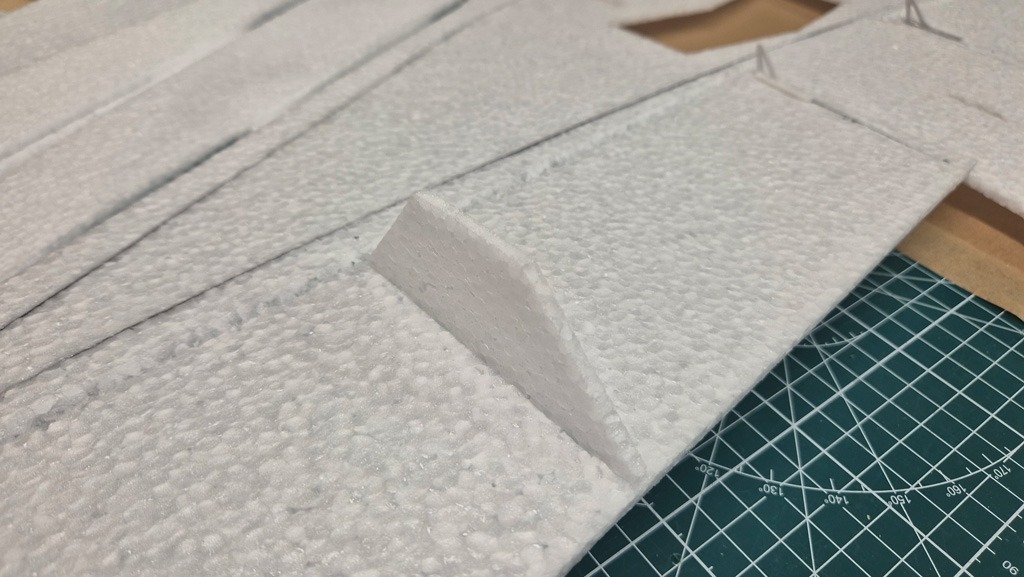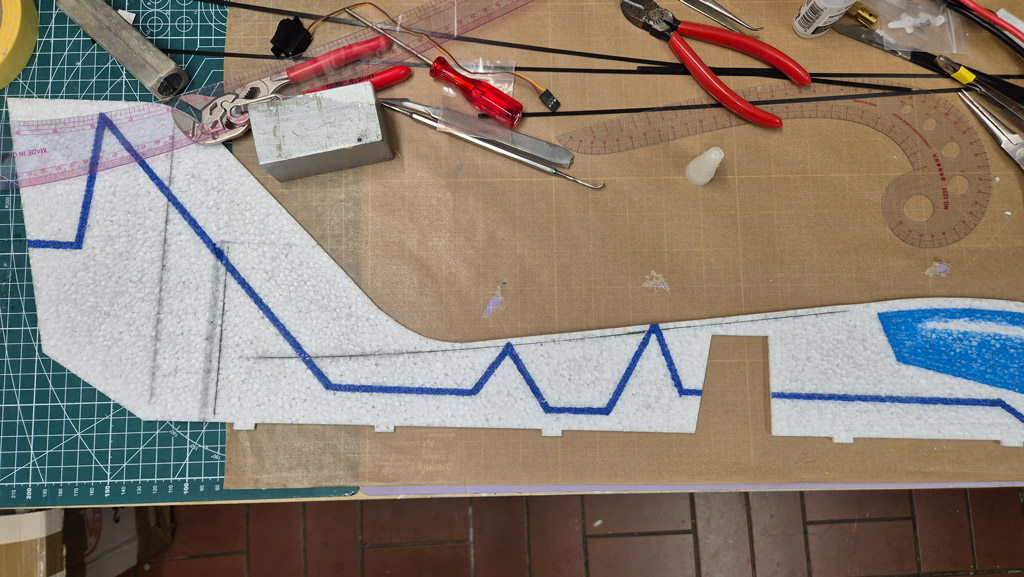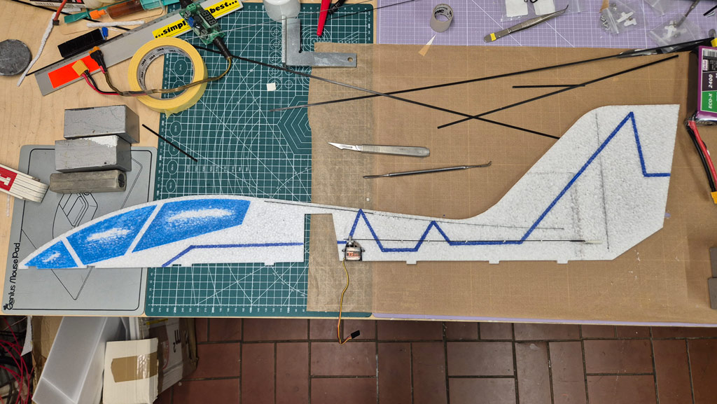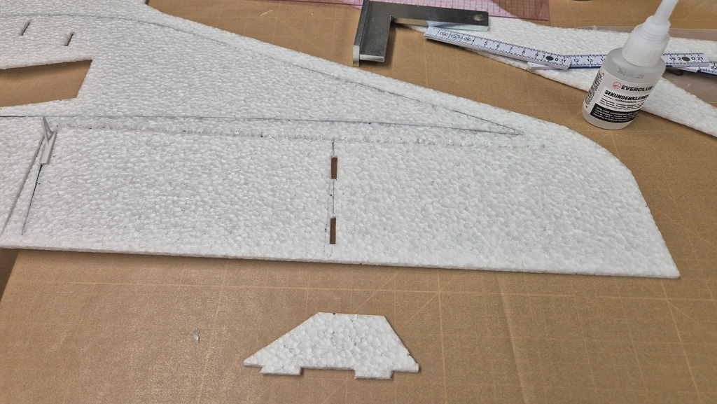 Weiterhin habe ich am Höhenruder den V-Ausschnitt noch nicht gemacht, um mehr Ruderfläche zu haben. Ich denke das lasse ich auch so. Das Seitenruder jedoch werde ich demnächst noch etwas verkleinern, so groß wie im Plan braucht es dann doch nicht zu sein.